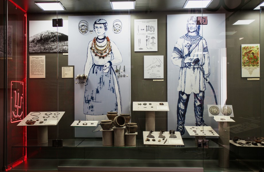 Посетители могут увидеть легендарные археологические памятники Гнёздовского комплекса (IX–X вв.): не имеющая аналогов в мире корчага-амфора с древнейшей русской надписью, знаменитые франкские стальные мечи, редчайшие золотые монеты – солиды византийских императоров Александра и Феофила, серебряные арабские монеты-дирхемы, бронзовые и латунные украшения, фибулы и пряжки.